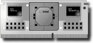 Au premier coup d'oeil, il est possible de le reconnaître. En effet, ici pas de Socket type 7 ou de package PGA, le processeur prend une toute autre forme. Il est désormais fourni sur un circuit imprimé, doté d'un connecteur plat à sa base. Sur ce circuit, le processeur partage l'espace disponible avec la mémoire cache Level2. La liaison entre ces deux composants s'effectue au travers d'un bus dédicacé à haute vitesse. Cette mémoire cache est désormais cadencée à la moitié de la fréquence du processeur. Si ce procédé n'est pas aussi véloce que sur un Pentium Pro, où la mémoire L2 est inclue dans le CPU et donc à même fréquence, il permet toutefois d'obtenir de bons résultats à moindre coût. La mémoire cache est de type Pipelined Burst Synchronous Static Ram (PBSRAM) et sa taille est de 512 Ko.